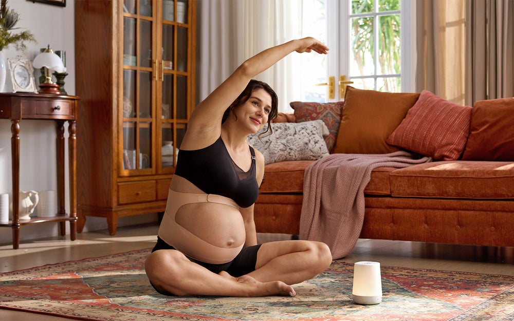 (A happy mom-to-be is wearing Momcozy Ergonest Maternity Belly Band, staying comfortable as her belly grows.)