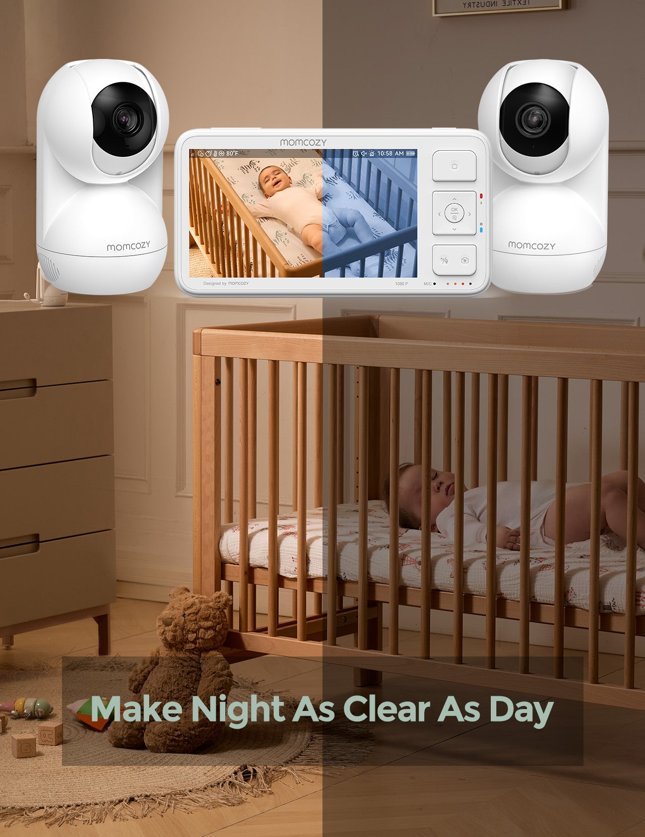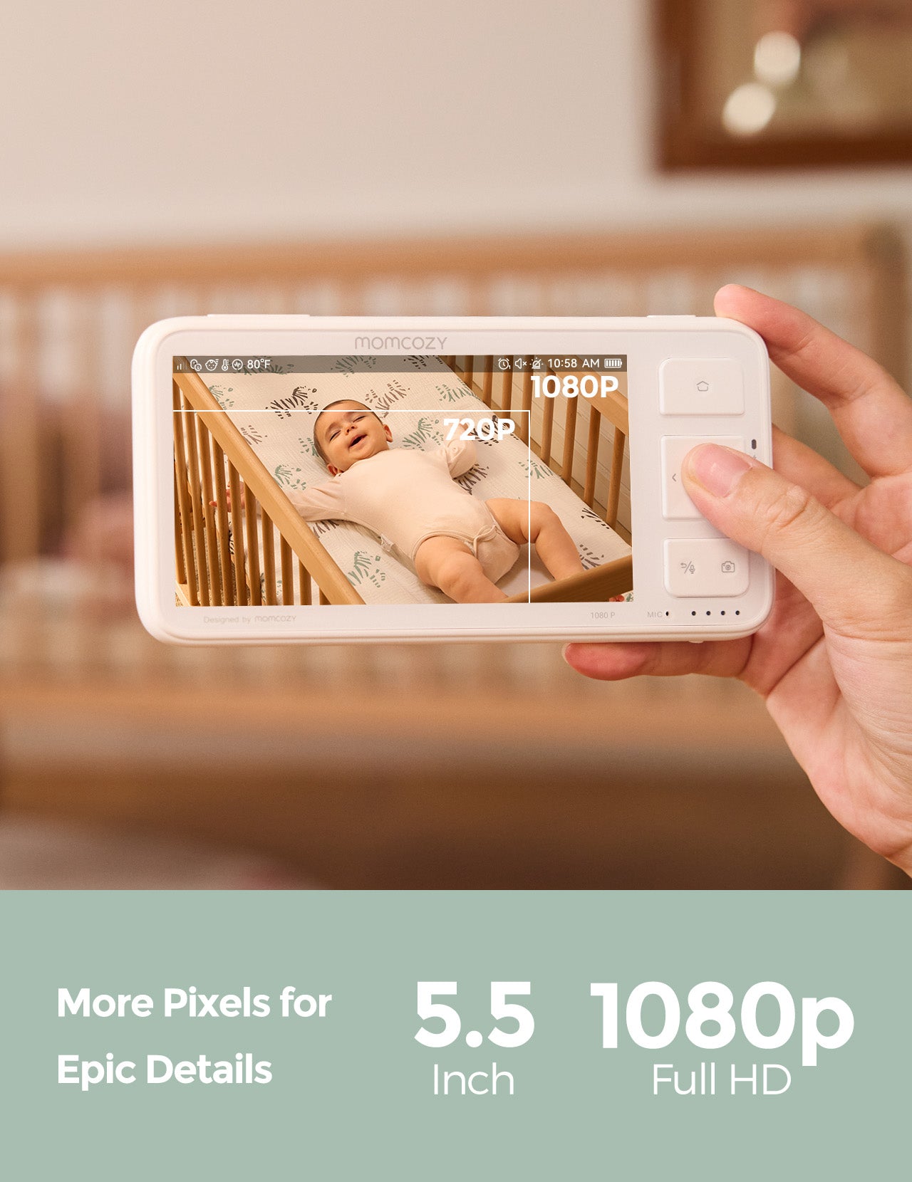 Introducing the new Momcozy Video Baby Monitor (BM03), designed for first-time and busy parents alike, embracing the essence of "smart parenting." The 5.5-inch large, 1080P high-resolution display offers a crystal-clear view of your baby at every moment, while the large 5800mAh battery lasts day and night. The strong signal supports an impressive 1640-feet range and is unstoppable by 2 walls, so you can check on your little one in the kitchen or living room. In addition, our video baby monitor can detect baby's motion, record one-minute videos, and save them on the included SD storage card for later playback. You can also capture a photo with a button press. So you won't miss your baby's special moments.