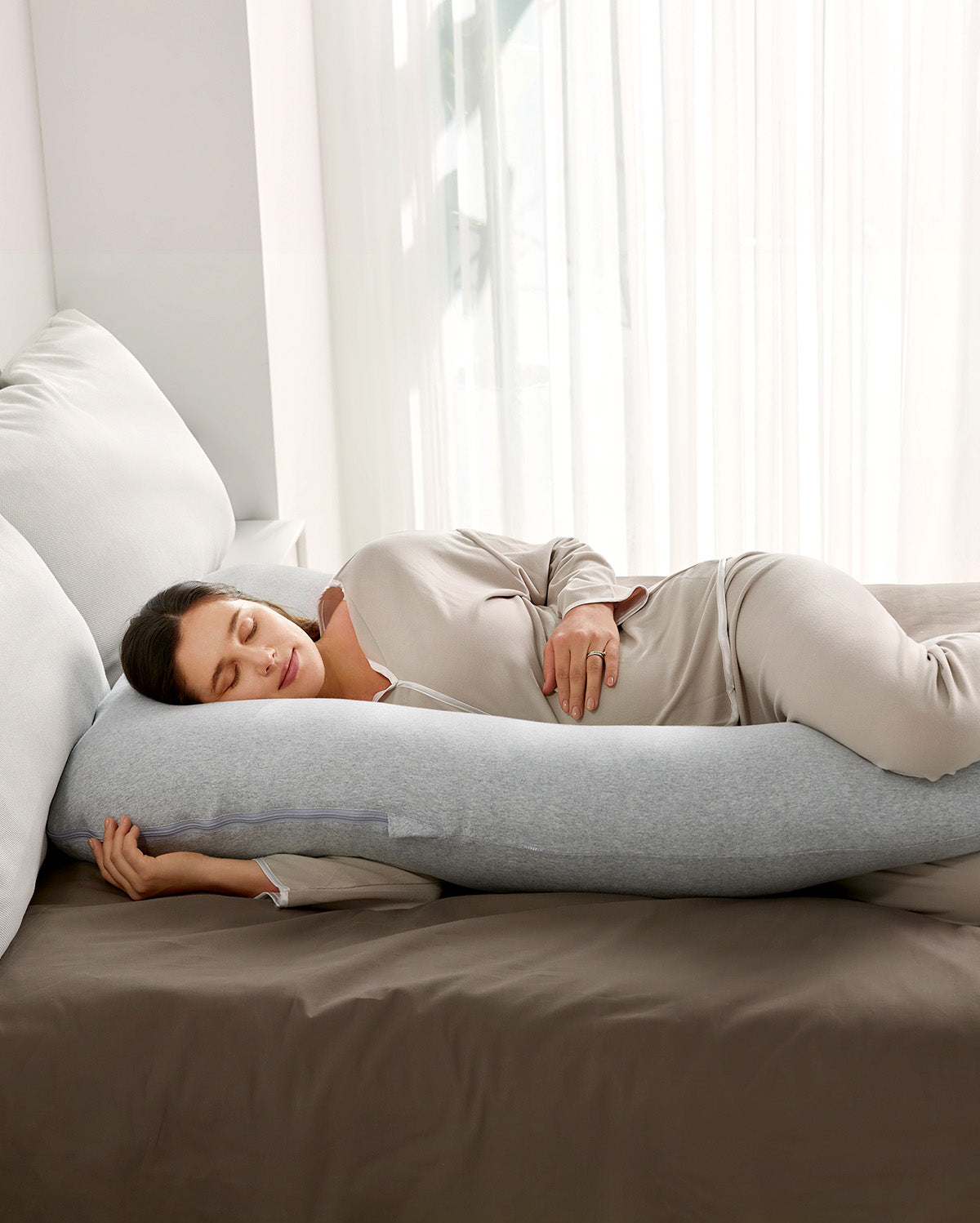 Pregnant woman resting comfortably on a gray U-shaped maternity body pillow, offering support and promoting restful sleep.