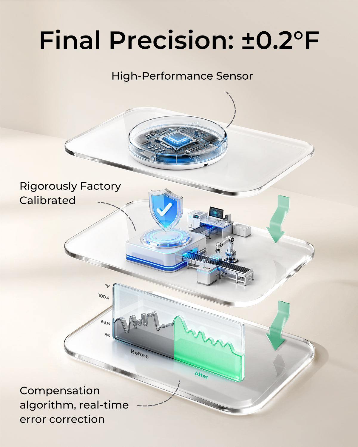 - 【±0.2°F High-Precision Sensor & Reliable Temperature Monitoring】Equipped with a built-in high-performance sensor and compensation algorithm, this wearable baby thermometer delivers instant readings with ±0.2°F accuracy. By tracking temperature changes, this baby thermometer helps you precisely identify your baby's needs—whether they require gentle care or closer attention,ensuring precise temperature monitoring and providing reliable insights for parenting decisions.