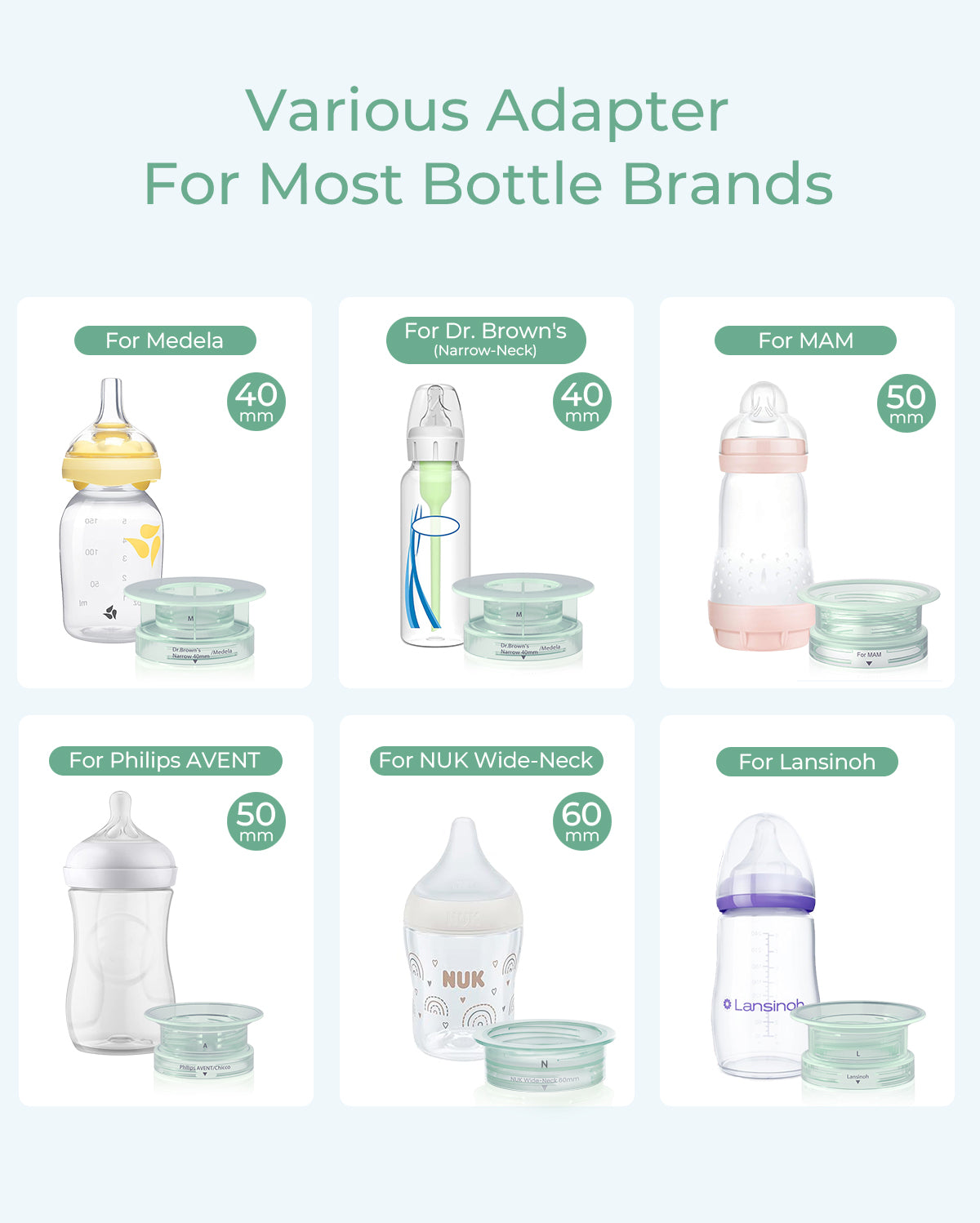 W zestawie znajduje się 5 adapterów do wszystkich głównych marek butelek.