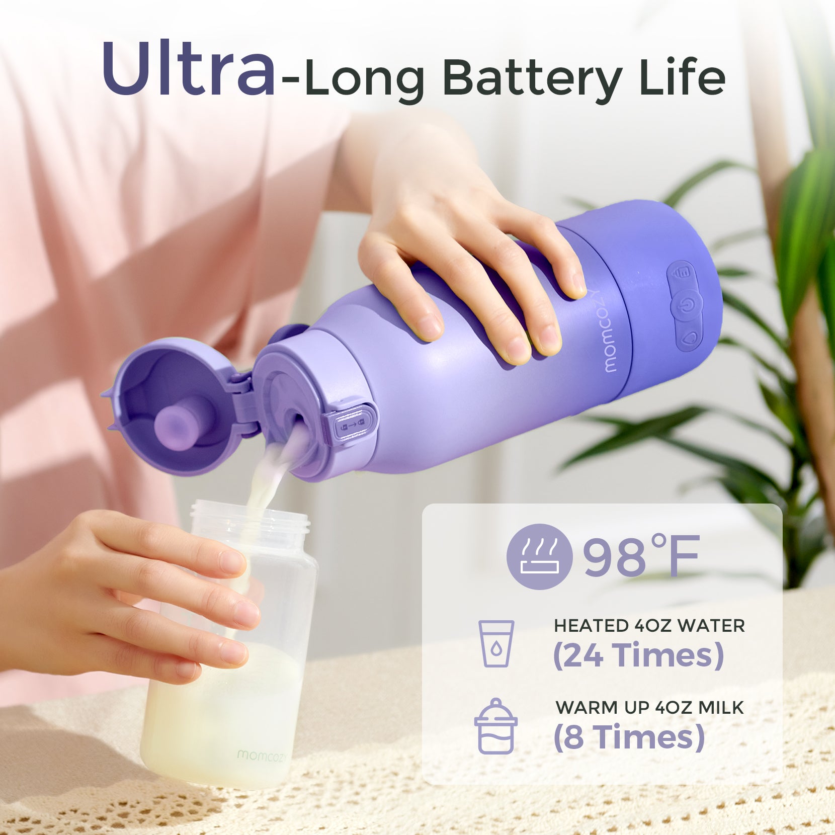 Designed for busy parents, a single charge can heat 4oz of water up to 24 times or warm 4oz of milk up to 8 times, giving you confidence for an entire day out without worrying about recharging.