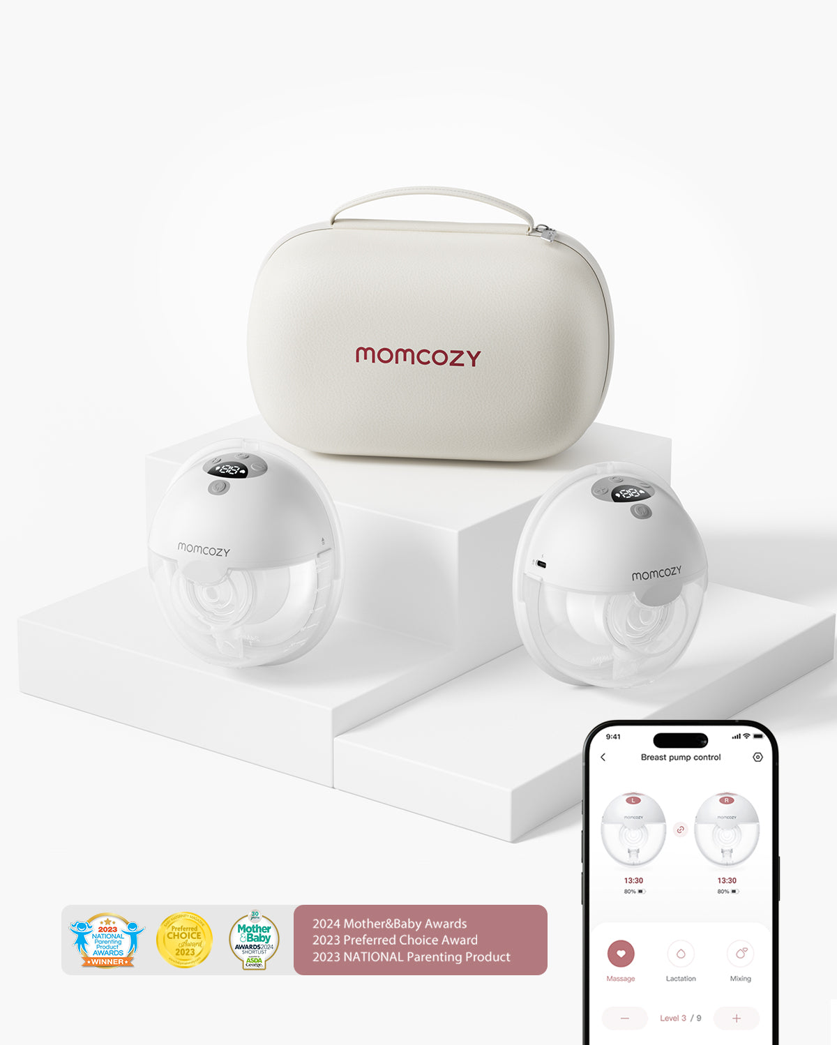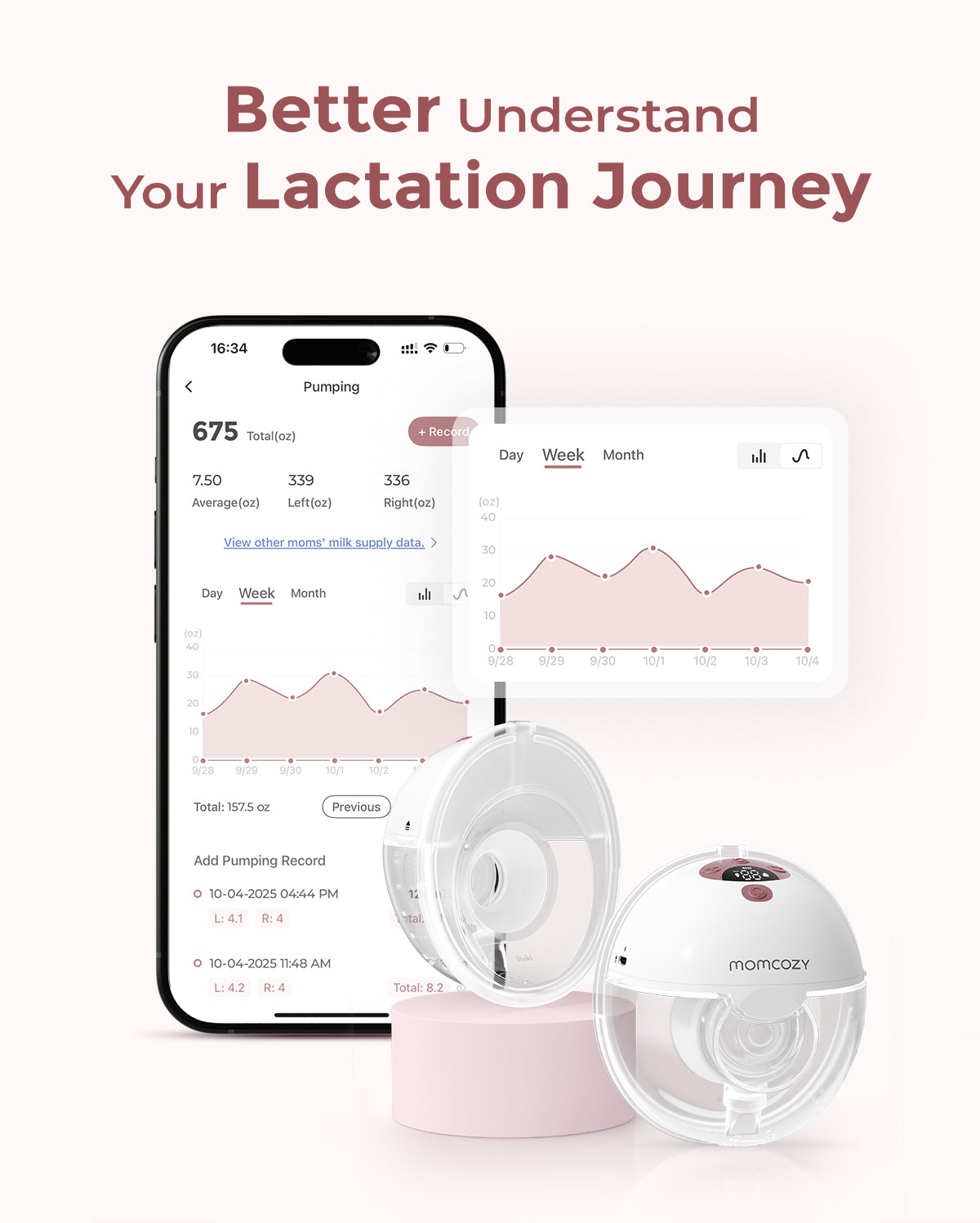 Steruj laktatorem za pomocą telefonu poprzez aplikację Momcozy. Dostosuj tryby odciągania i poziomy ssania, przełączaj między odciąganiem pojedynczym a podwójnym oraz śledź ilość pokarmu i trendy — bez sięgania do biustonosza lub poprawiania guzików podczas działania.