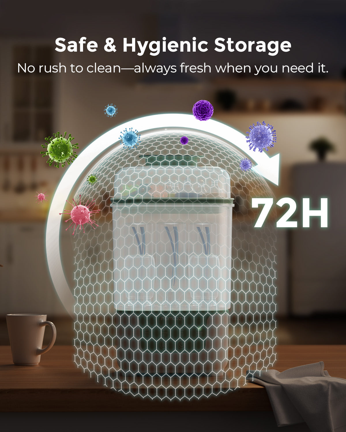 Butelki pozostają czyste i gotowe do użycia nawet przez 72 godziny, dzięki czemu możesz karmić dziecko zgodnie ze swoim harmonogramem, bez obaw.
