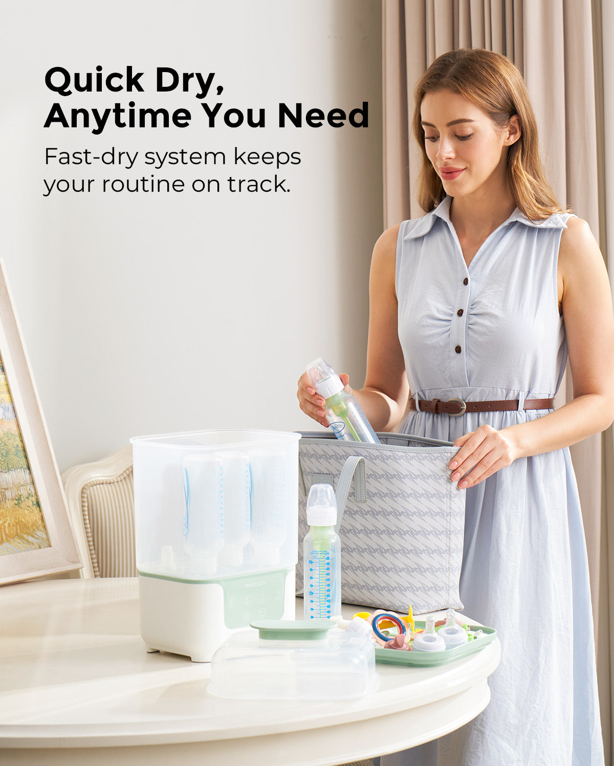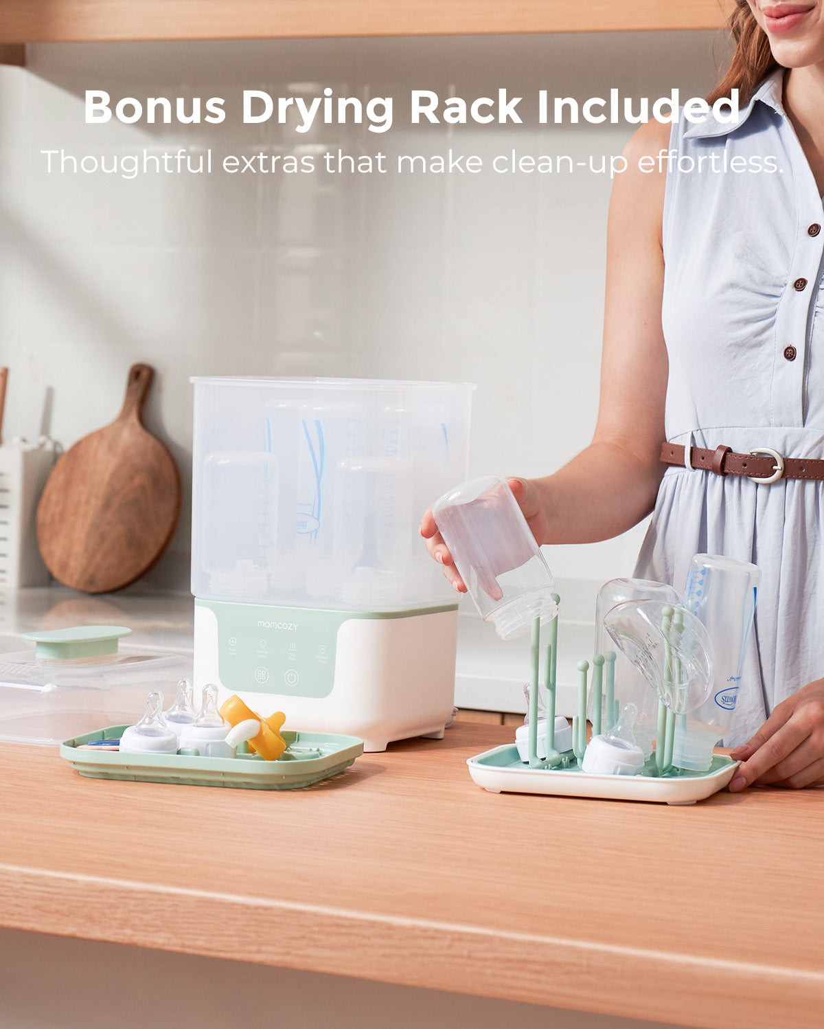 Zadbaj o to, by akcesoria do karmienia Twojego dziecka były bezpieczne, suche i zawsze gotowe — bez zbędnych problemów. Sterylizator i suszarka do butelek Momcozy 4-w-1 łączy sterylizację, suszenie, przechowywanie i tryb automatyczny w jednym eleganckim, kompaktowym urządzeniu — zaprojektowanym, aby oszczędzać czas i ułatwiać życie świeżo upieczonym rodzicom.