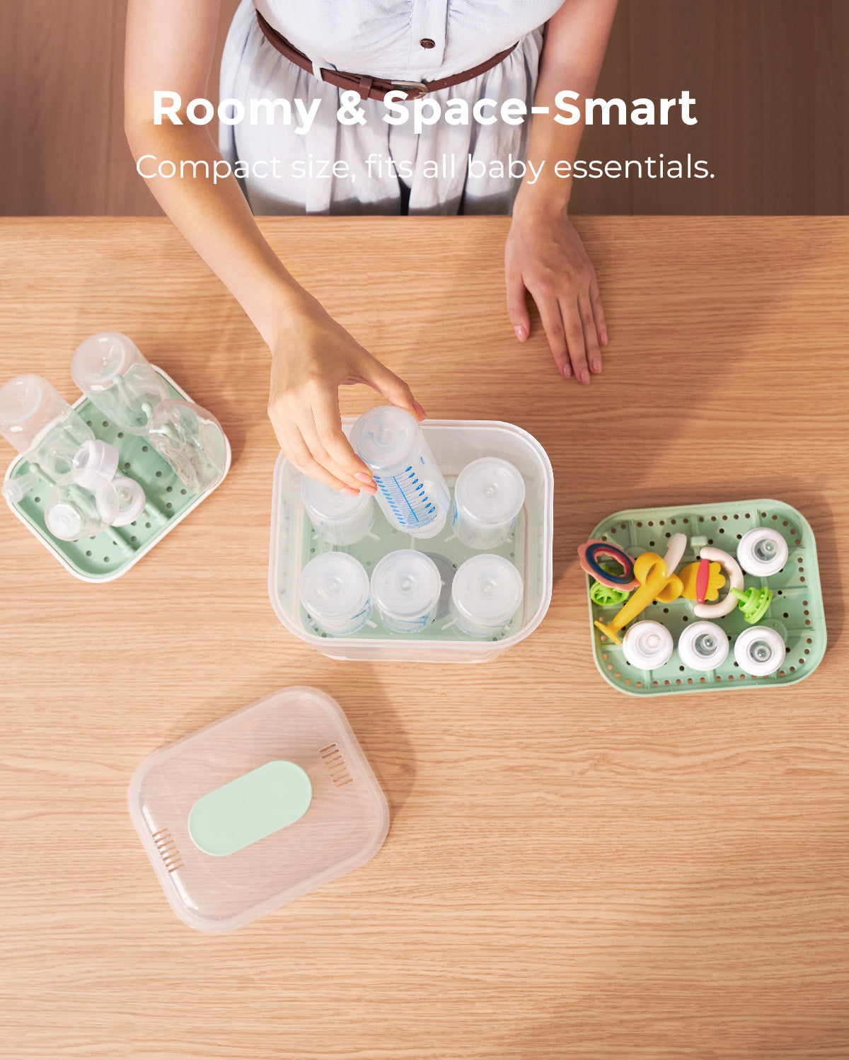 Sterylizator Momcozy jest o 19% mniejszy niż porównywalne modele, a mimo to mieści do 6 standardowych butelek oraz akcesoria dla noworodków, takie jak smoczki, części laktatora i zabawki.