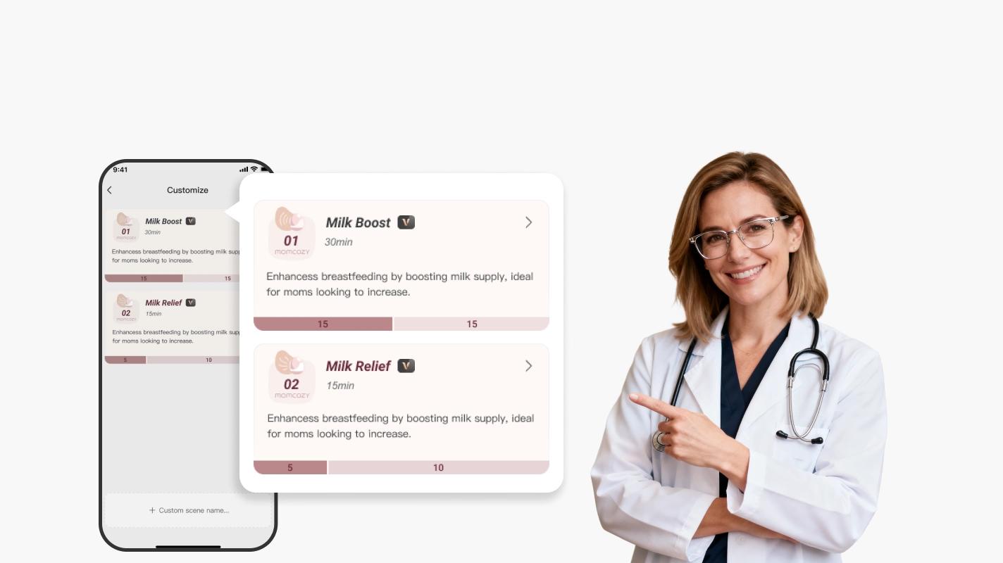 · Inteligentne połączenie z aplikacją – Synchronizuje się z aplikacją Momcozy, zapewniając automatyczną zmianę trybów, śledzenie ilości mleka w czasie rzeczywistym, alerty o pełnym pojemniku i inne funkcje.