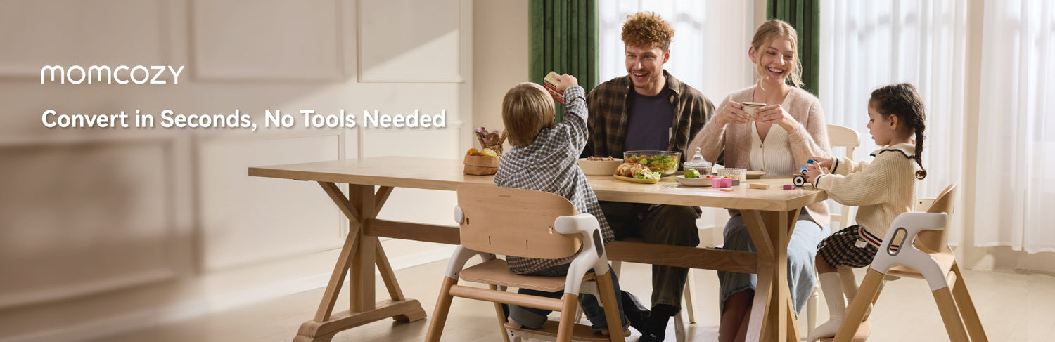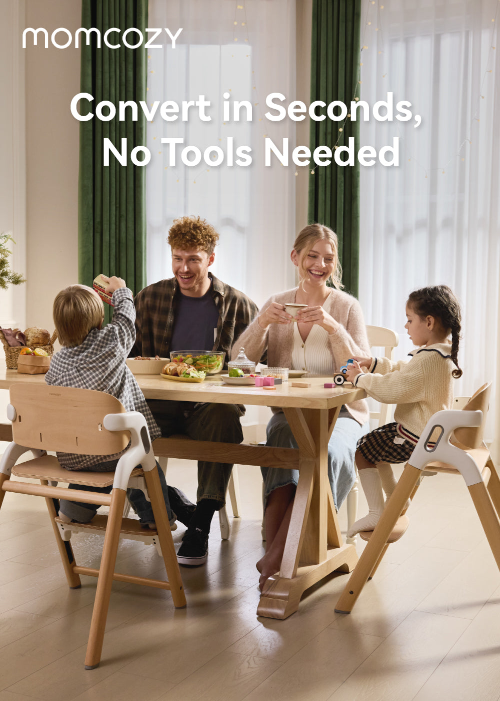 Momcozy DinerPal Krzesełko do Karmienia – rośnie razem z dzieckiem, od 6. miesiąca życia aż do dorosłości. Oferuje 5 trybów użytkowania – od zestawu dla niemowlaka po krzesło dla dorosłych, wytrzymując obciążenie do 140 kg. Regulowane siedzisko i podnóżek zapewniają ergonomiczną wygodę na każdym etapie rozwoju. Dla bezpieczeństwa malucha krzesełko wyposażono w 5-punktowe pasy, stabilną trójkątną ramę i antypoślizgowe silikonowe nóżki. Obszerna tacka, nadająca się do mycia w zmywarce, pasuje do większości miseczek z przyssawką, a całe krzesełko łatwo utrzymać w czystości dzięki powierzchni do wycierania i pasom bezpieczeństwa, które można prać w pralce. Wykonane z wysokiej jakości drewna bukowego z certyfikatem FSC oraz plastiku zatwierdzonego przez FDA – dla zdrowia dziecka i Twojego spokoju.