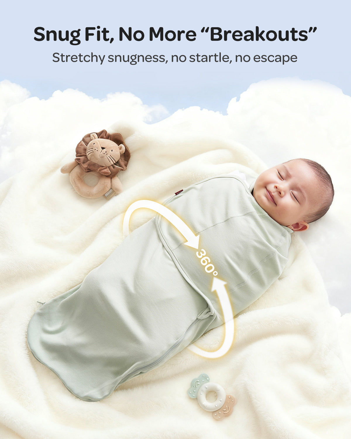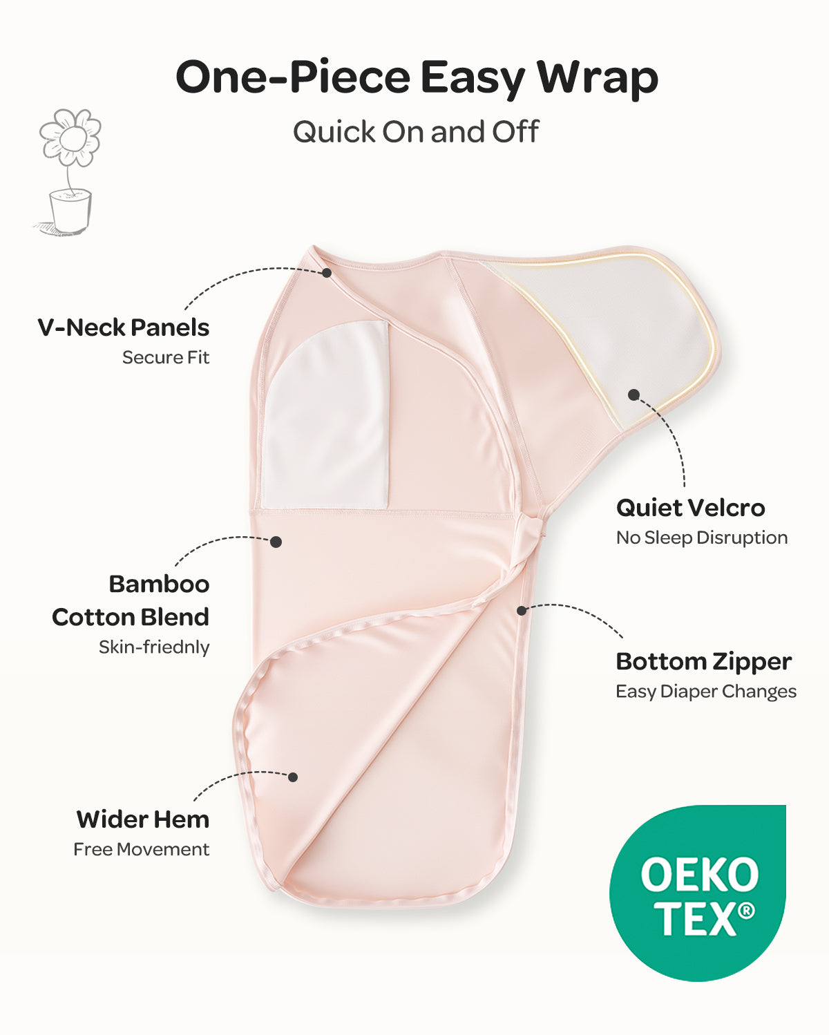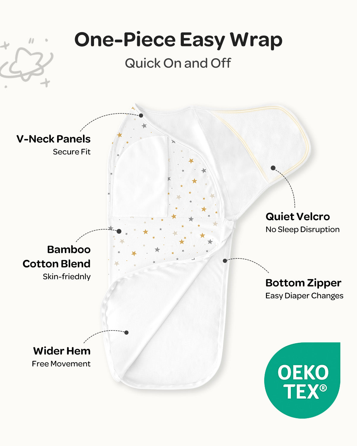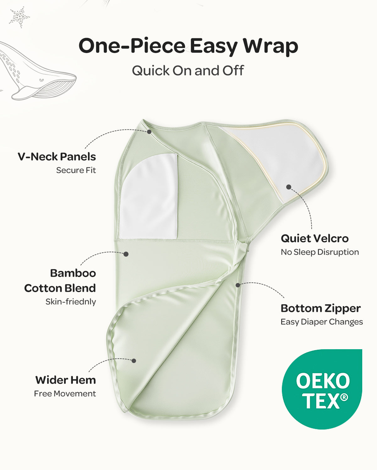 Jednoczęściowa konstrukcja otulacza zapewnia kojące, przypominające łono uczucie. Elastyczna tkanina bambusowa i dopasowane otulenie delikatnie utrzymują ramiona dziecka blisko ciała, co pomaga zmniejszyć odruch Moro (odruch wystraszenia) i pozwala na spokojniejszy, bardziej regenerujący sen.
