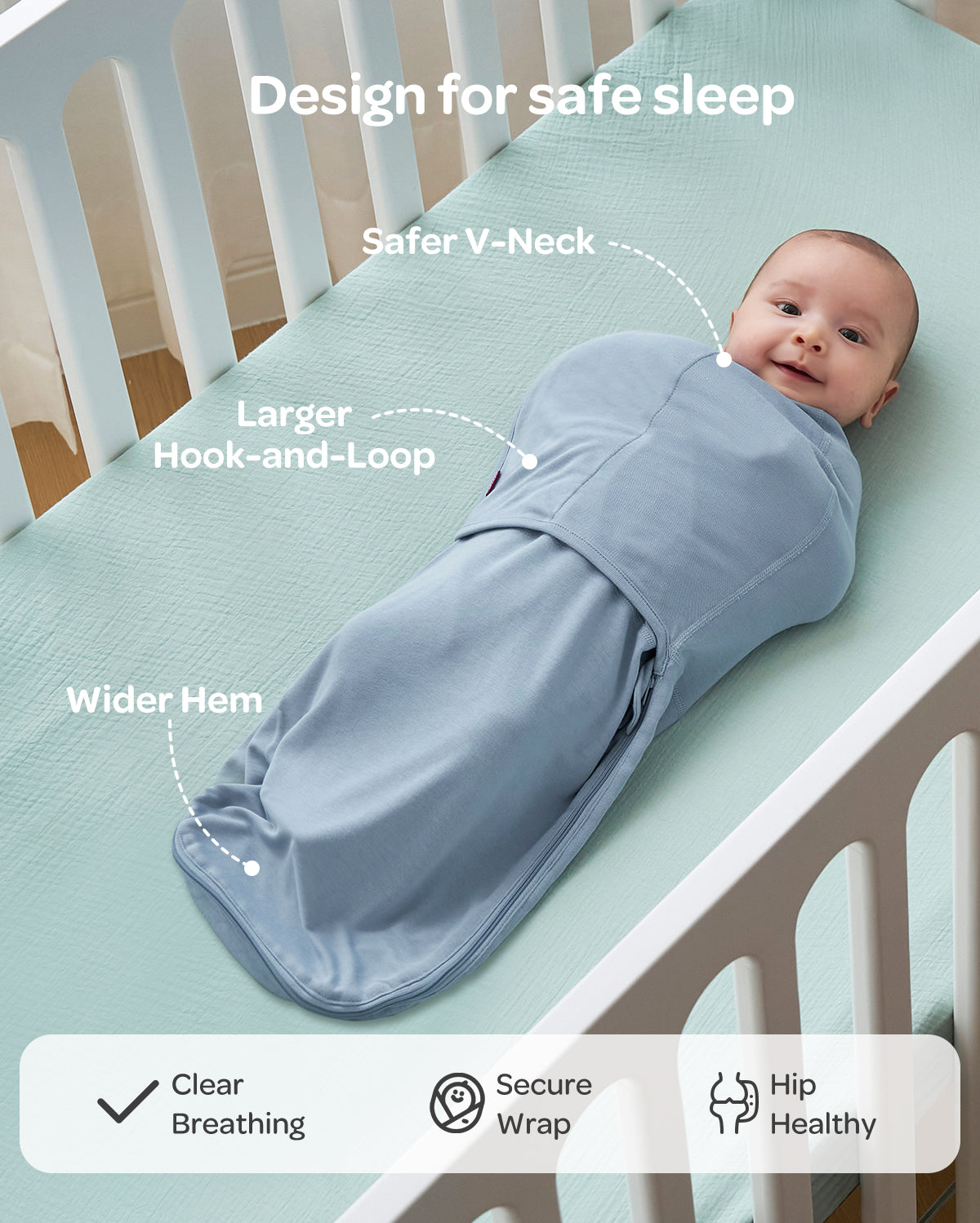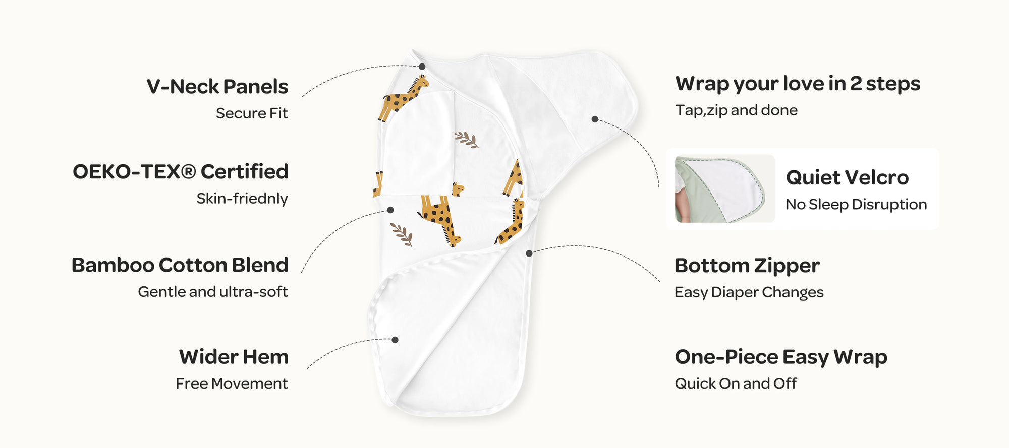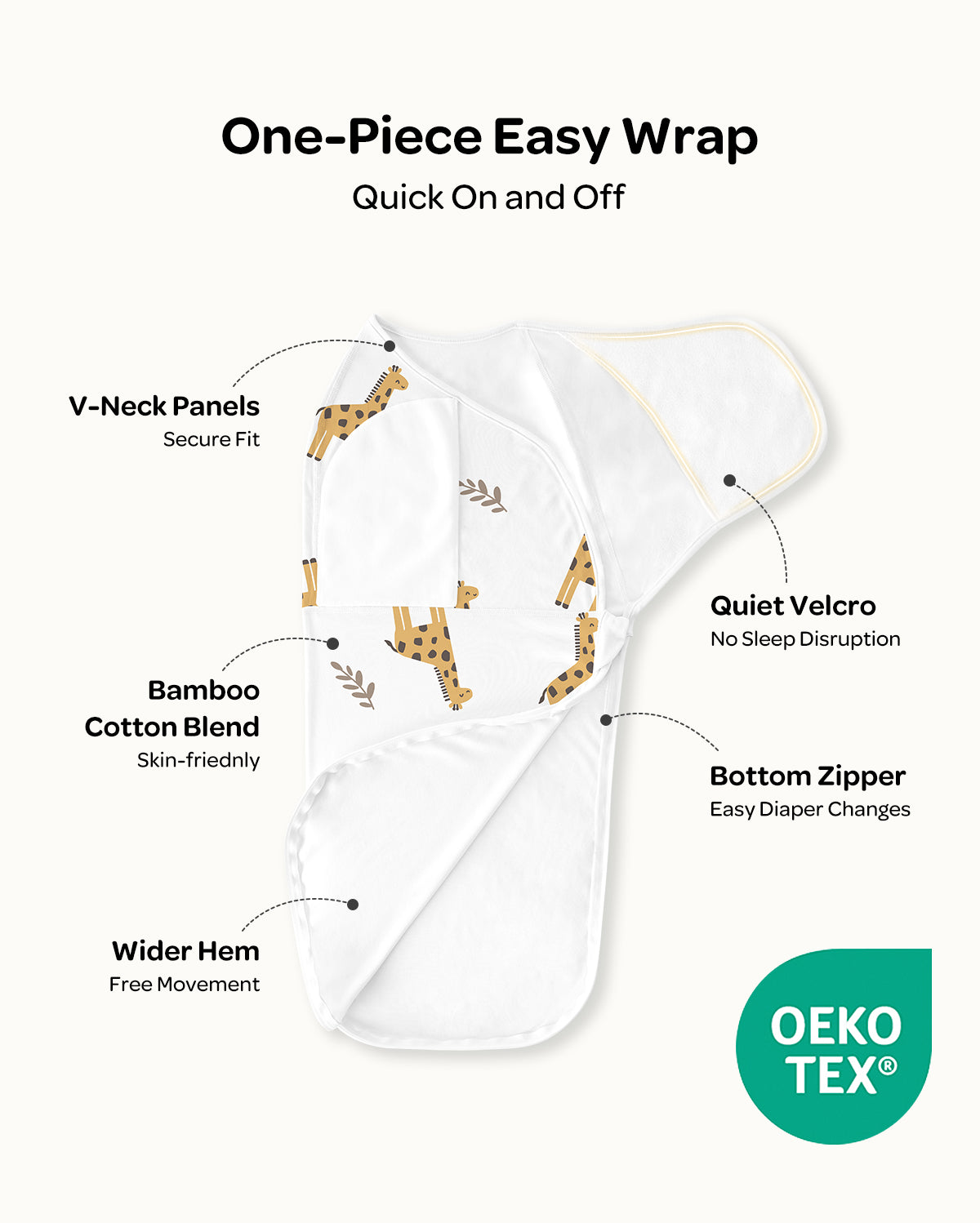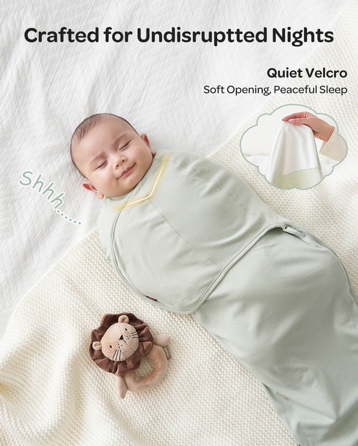 Jednoczęściowa konstrukcja otulacza zapewnia kojące, przypominające łono uczucie. Elastyczna tkanina bambusowa i dopasowane otulenie delikatnie utrzymują ramiona dziecka blisko ciała, co pomaga zmniejszyć odruch Moro (odruch wystraszenia) i pozwala na spokojniejszy, bardziej regenerujący sen.