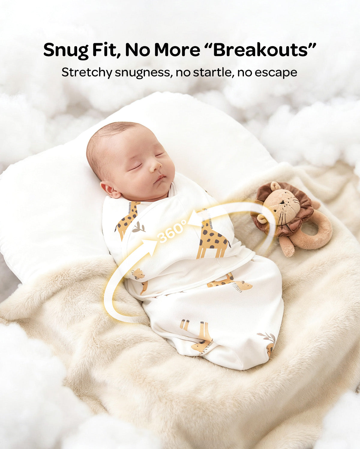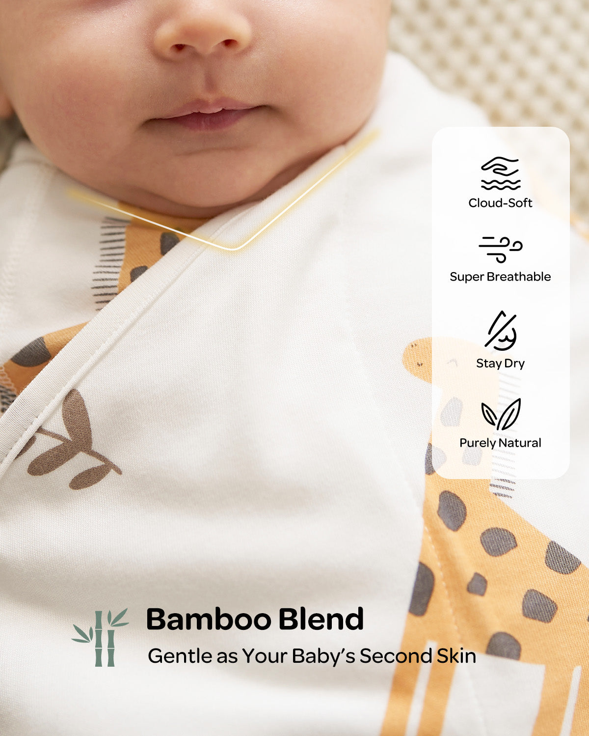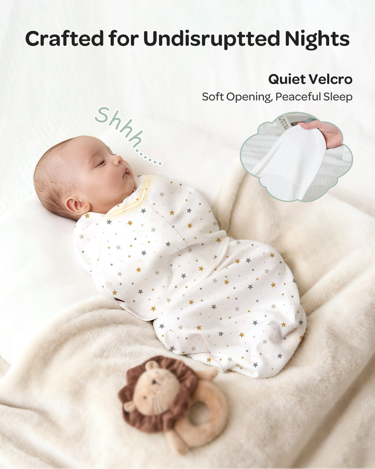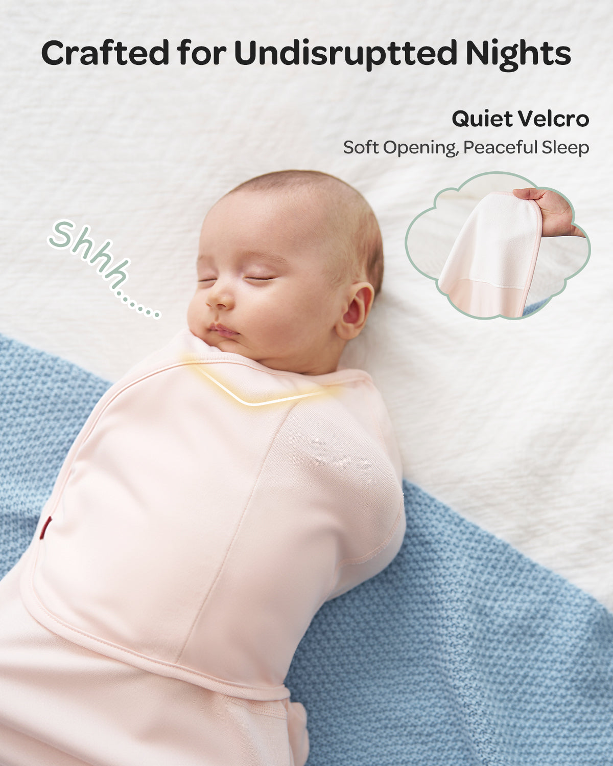 Jednoczęściowa konstrukcja otulacza zapewnia kojące, przypominające łono uczucie. Elastyczna tkanina bambusowa i dopasowane otulenie delikatnie utrzymują ramiona dziecka blisko ciała, co pomaga zmniejszyć odruch Moro (odruch wystraszenia) i pozwala na spokojniejszy, bardziej regenerujący sen.