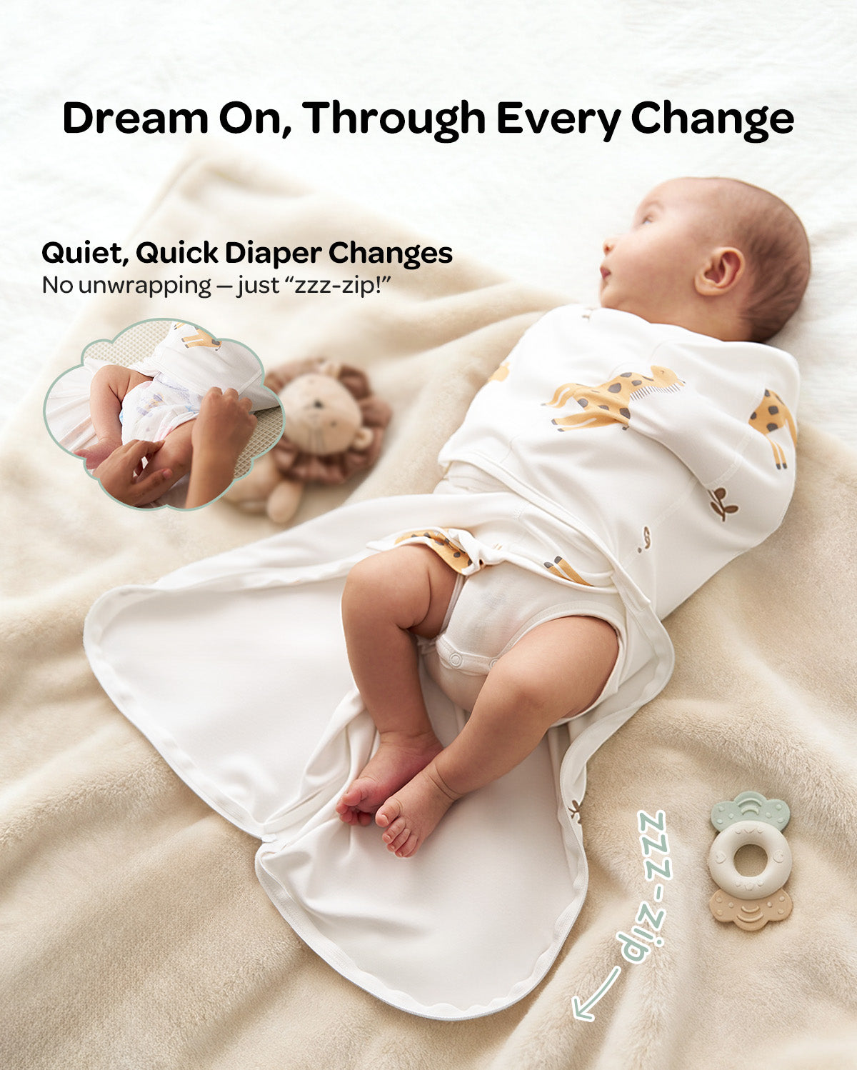 Tak. Ten otulacz został zaprojektowany z myślą o nieprzerwanym śnie. Posiada ultra-cichy rzep, który nie przestraszy Twojego dziecka, oraz wygodny zamek błyskawiczny u dołu. Możesz łatwo rozpiąć dół, aby szybko i spokojnie zmienić pieluszkę, nie rozwijając całkowicie dziecka.
