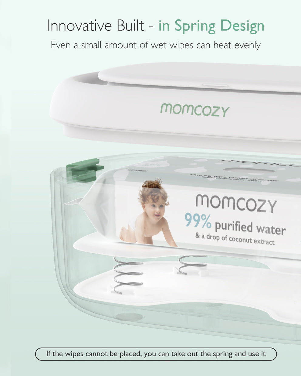Nie musisz się już martwić, że nie podgrzejesz chusteczek, gdy jest ich niewiele. Konstrukcja ze sprężyną utrzymuje chusteczki blisko górnej części podgrzewacza, dzięki czemu każda wyciągnięta chusteczka jest ciepła. (Jeśli chusteczki nie mieszczą się, możesz wyjąć sprężynę i używać urządzenia bez niej.)