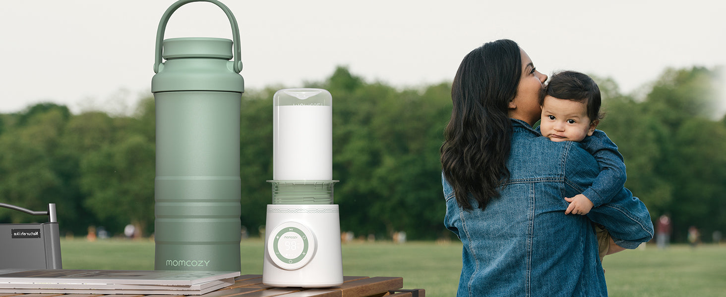Mother feeding baby from portable bottle outdoors, showcasing Momcozy products.