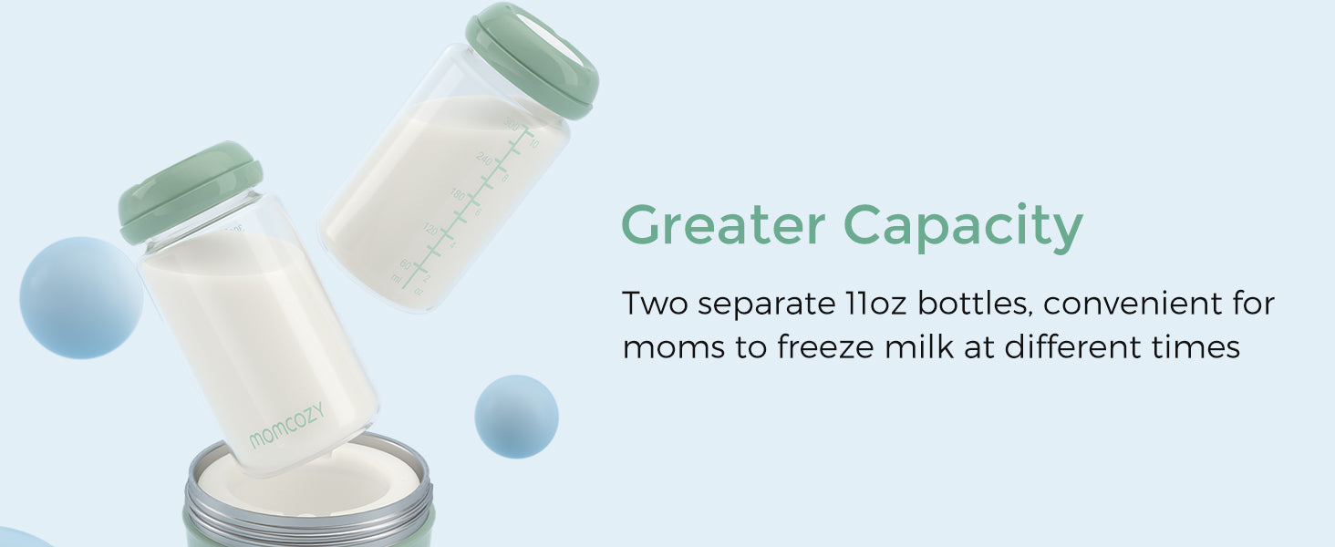 The portable breast milk cooler has a total capacity of 22oz (approximately 650ml). This is split between two separate 11oz (325ml) storage bottles, which is ideal for storing milk from multiple pumping sessions throughout a full workday or day out.