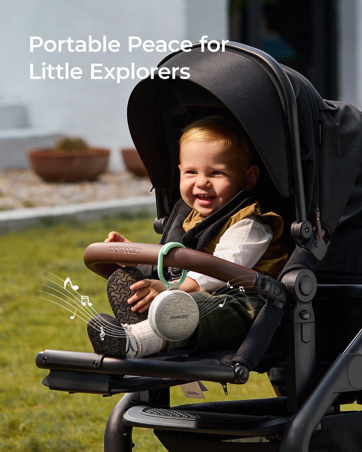 Momcozy portable sound machine attached to stroller, providing peace with white and gray speaker and green handle.