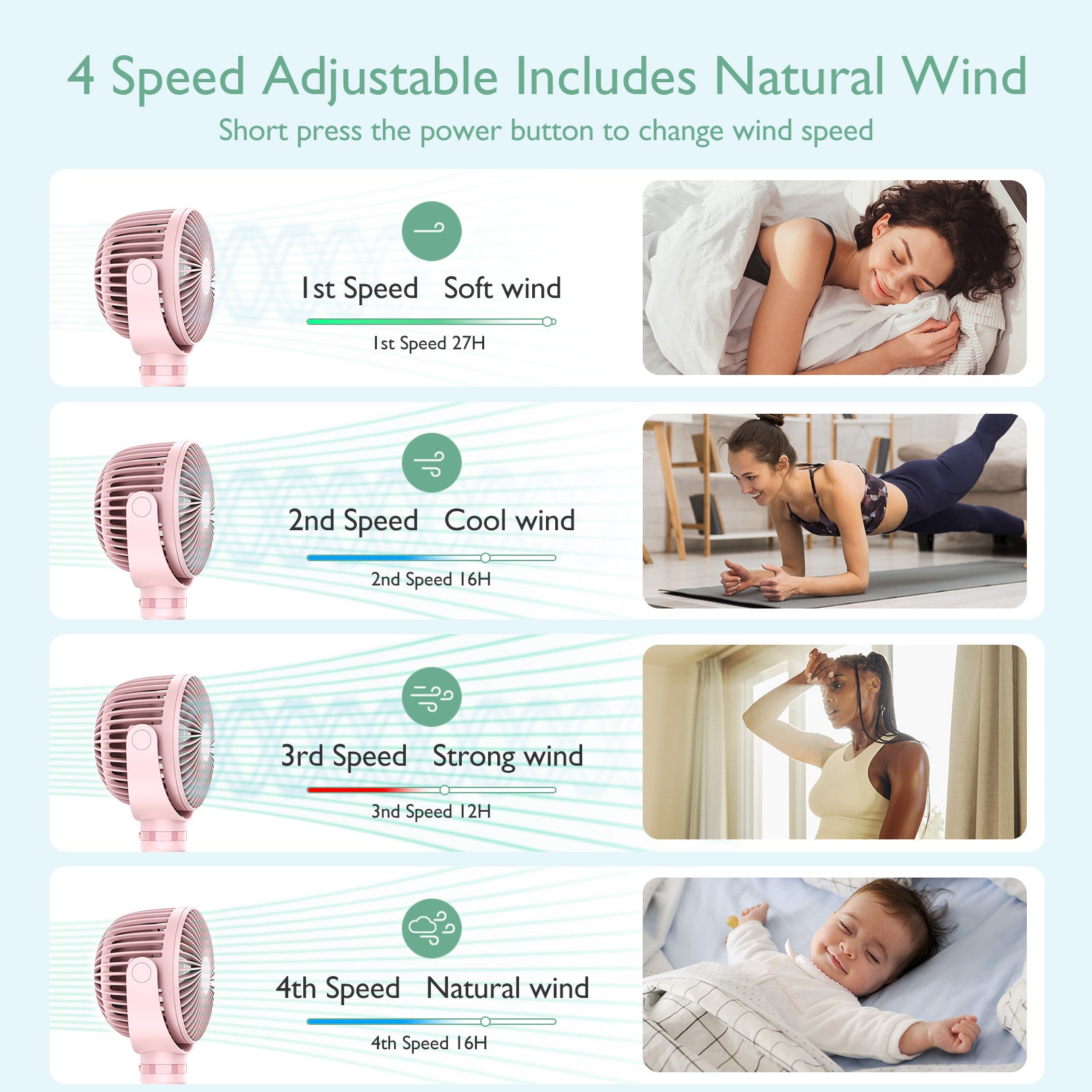 - Obrót 360° i 4 prędkości: Głowica wentylatora Momcozy do wózka dziecięcego może być regulowana pionowo i poziomo w dowolnym kierunku, zapewniając chłodny nawiew z każdej strony, utrzymując dziecko w komforcie w gorące dni. Posiada 3 prędkości do różnych zastosowań, a czwarty poziom to naturalny wiatr, który jest bardziej komfortowy dla niemowląt.