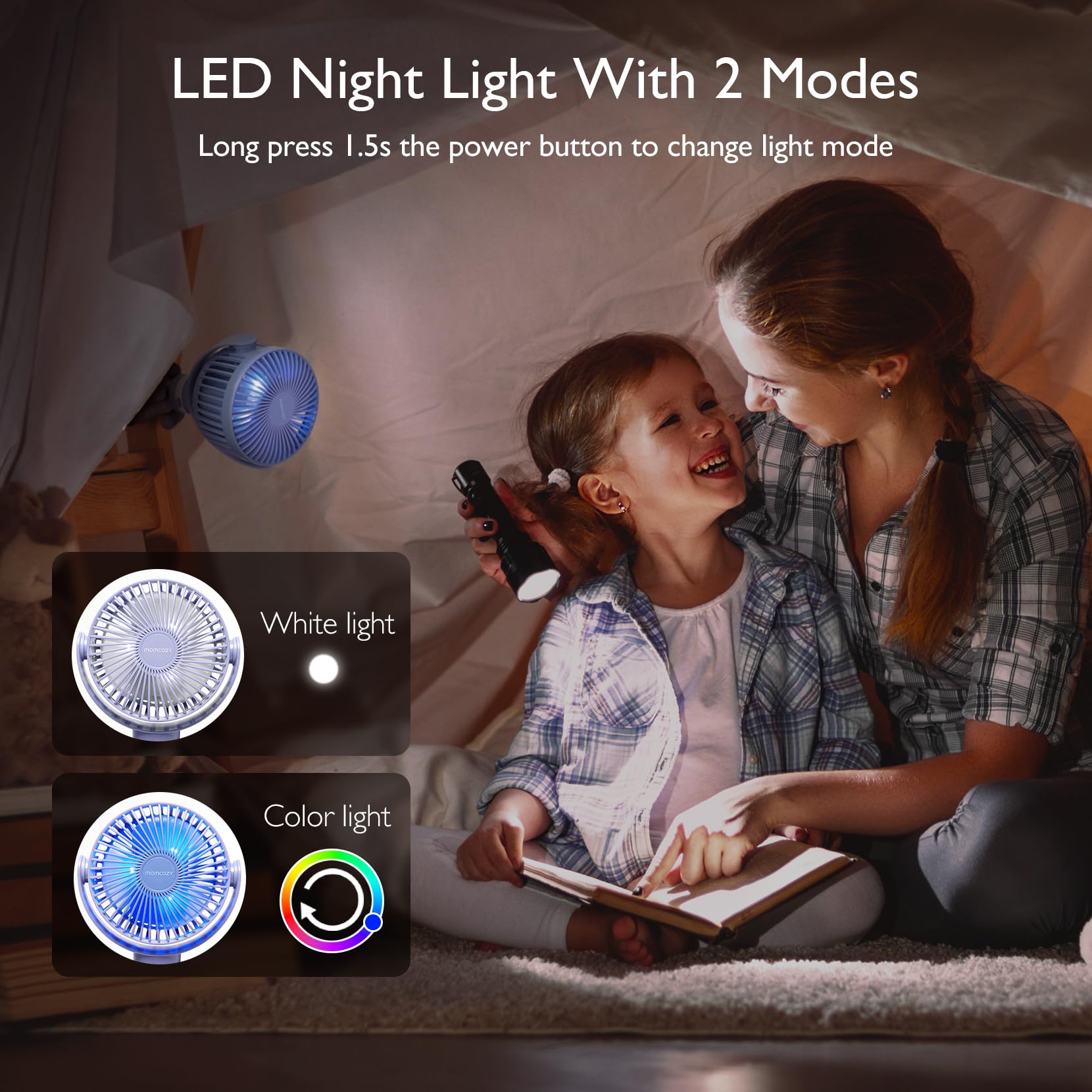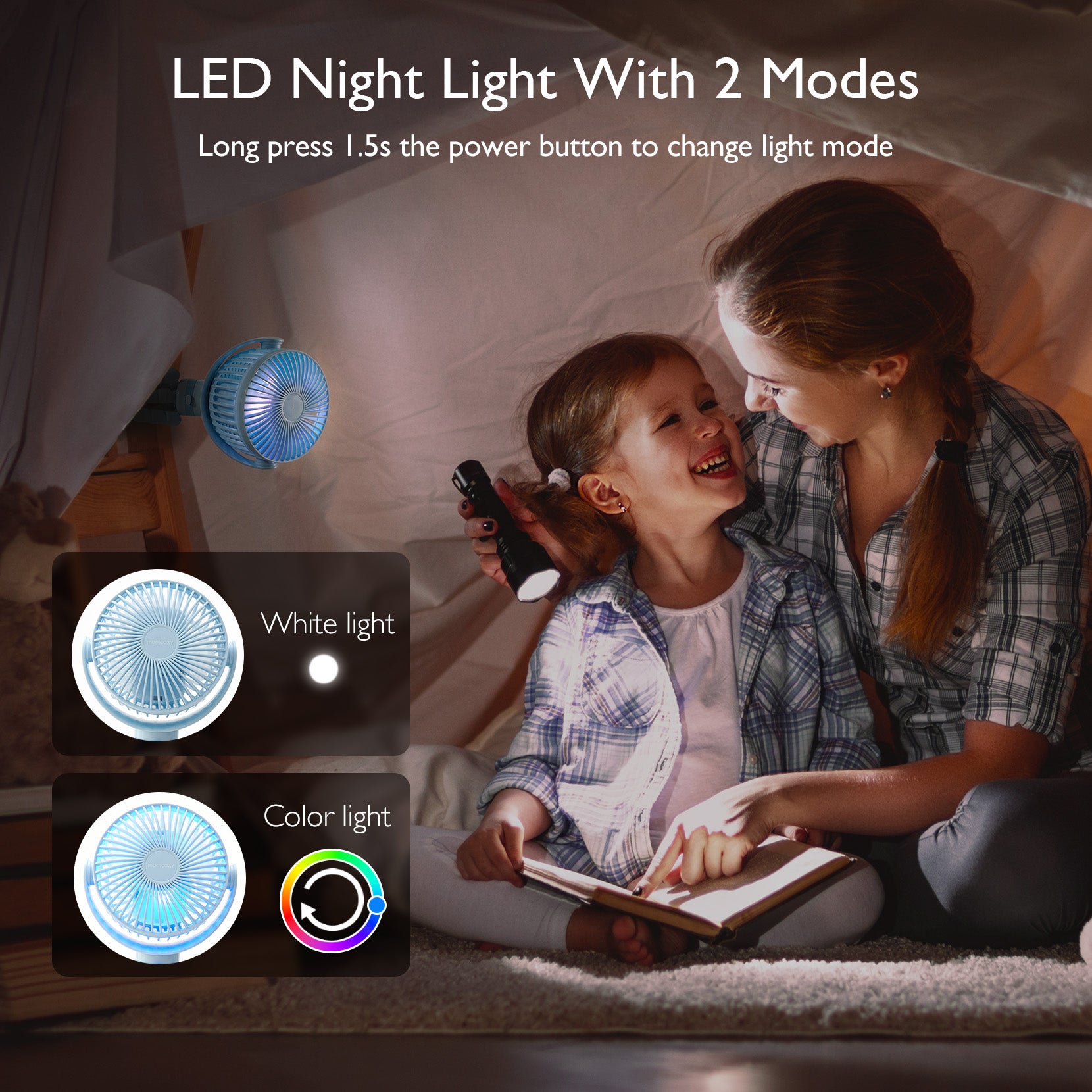 - Nowa wersja przyjazna dziecku: Mniejsza szczelina kratki wentylatora <5 mm w pełni chroni dziecko i zapobiega przypadkowemu dotknięciu łopatek; lampka nocna LED z 2 trybami — trybem białego światła oraz trybem zmieniających się kolorów — rozświetla noc, daje dziecku poczucie bezpieczeństwa i ułatwia mamie oraz starszym osobom funkcjonowanie w ciemności.